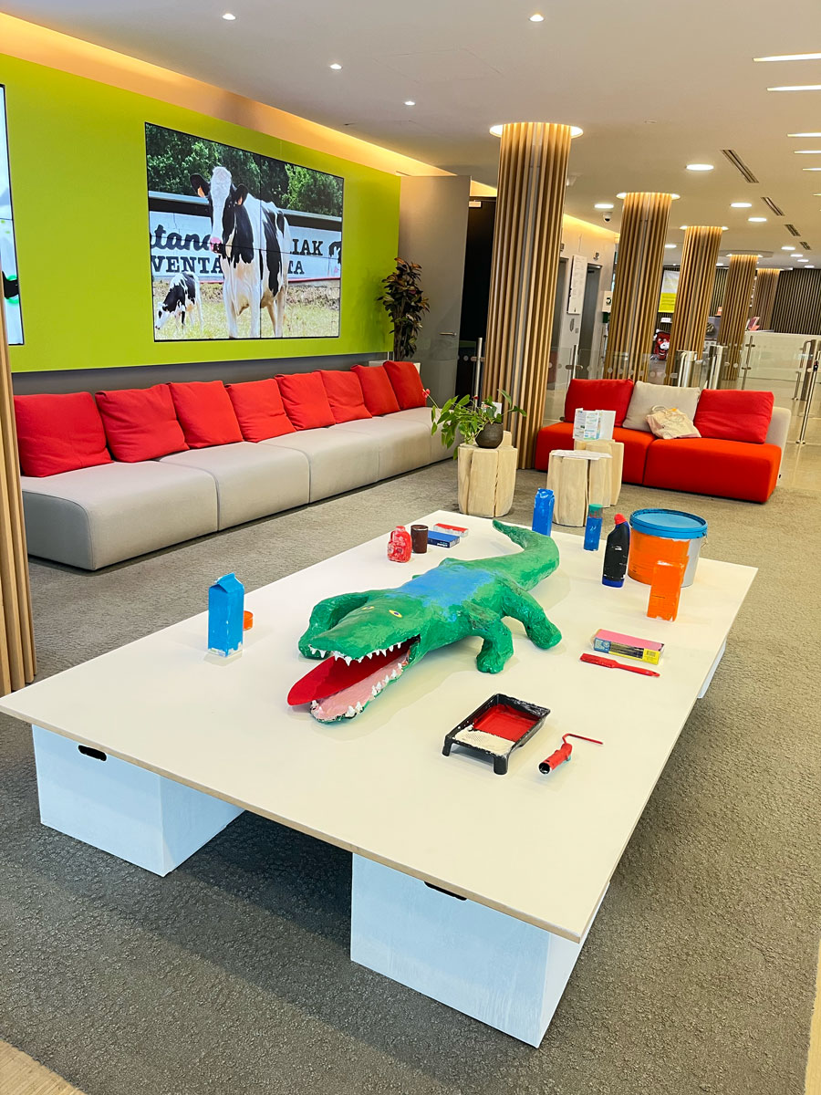 Crocodile: papier mâché, wood, reinforced meshing, acrylic paint, 23 x 190 x 70 cm;