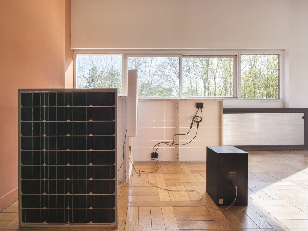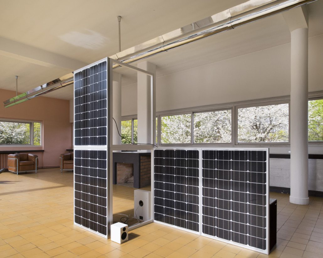 Used for the first time in the artist’s work, the solar panels that structure the sculptural ensembles presented at the villa offer an incontestable visual quality, creating abstract geometric compositions such as the ones used in the poster for the exhibition (which is also an allusion to the floor plan or layout of the first floor of the villa). Normally designed for outdoor use, the solar panels have been placed inside the building, in a reversal effect which nevertheless does not undermine their habitual mode of functioning. The sunlight that is very much present in the rooms of the villa makes it possible, once captured by the panels, to provide the vital energy needed to make these pieces work. The light is a direct source of energy for the sound and light systems of which these artworks are composed.